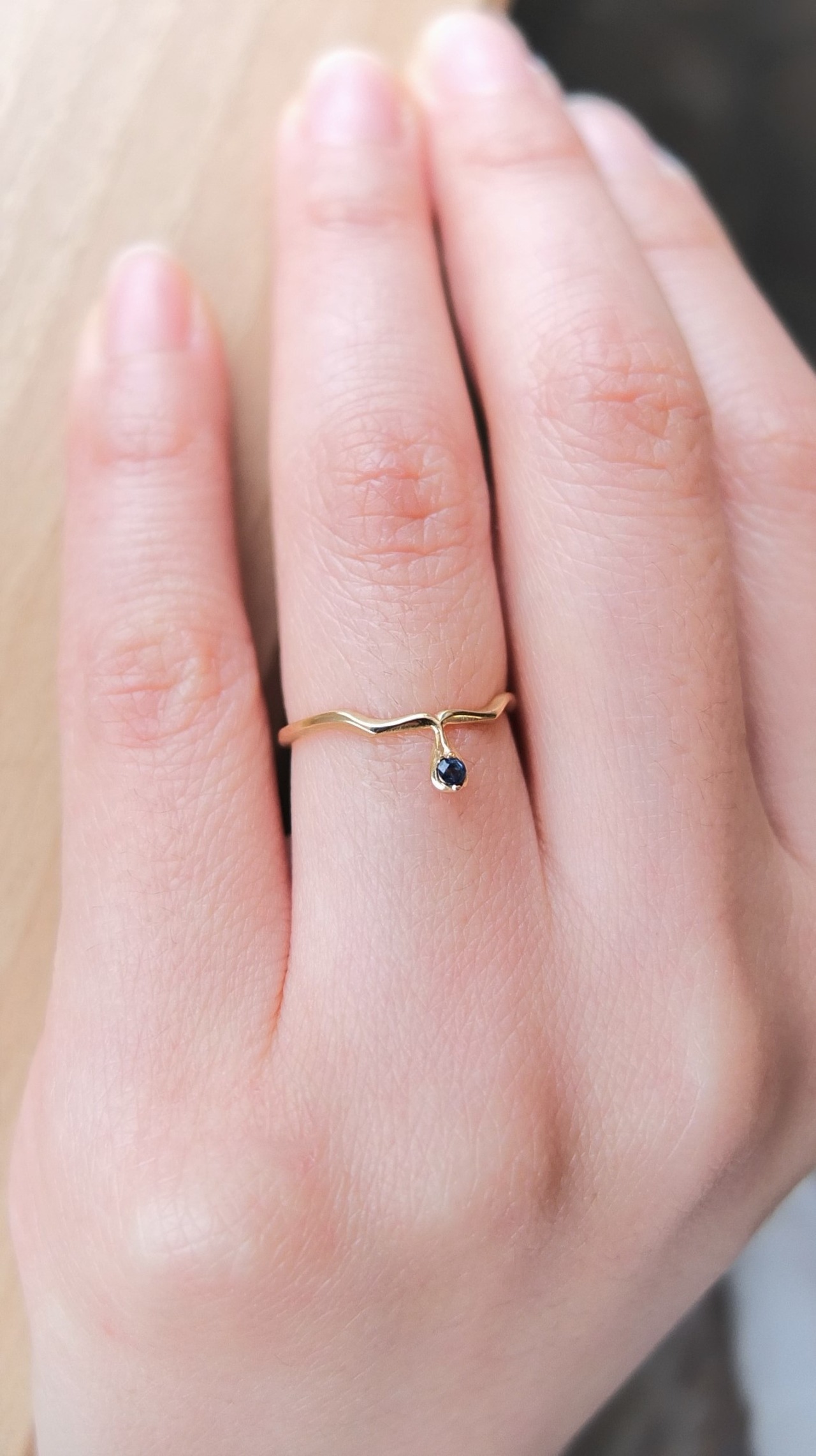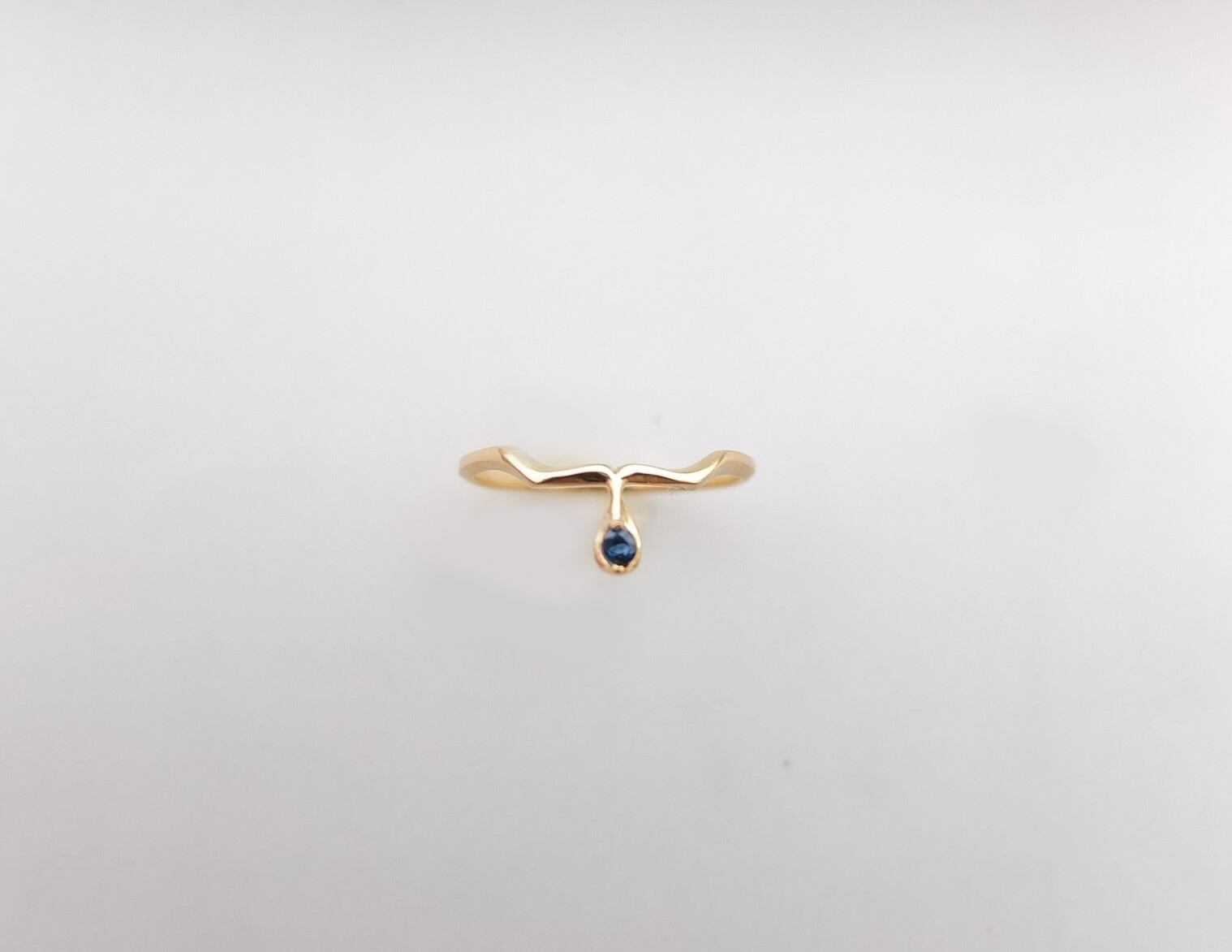 真ん中にあるしずく型の部分に9月の誕生石でもあるブルーサファイア石を留め、全体がVラインになるため指長効果もあります。