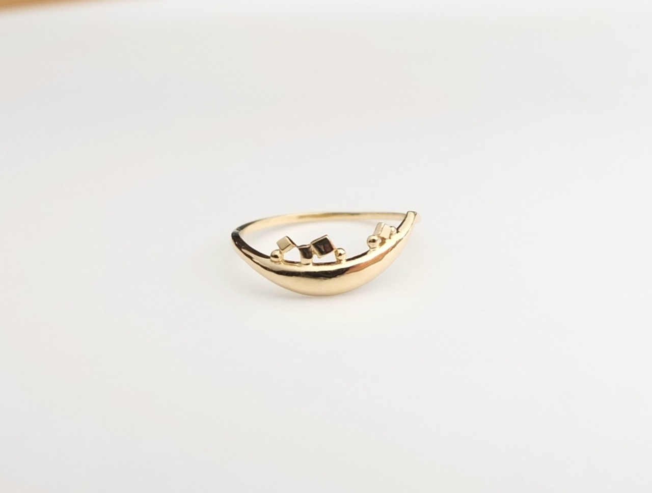 月の上に小さなマルや四角の星をイメージしたパーツを乗せ繊細さを感じる細身のリングに仕上げました。