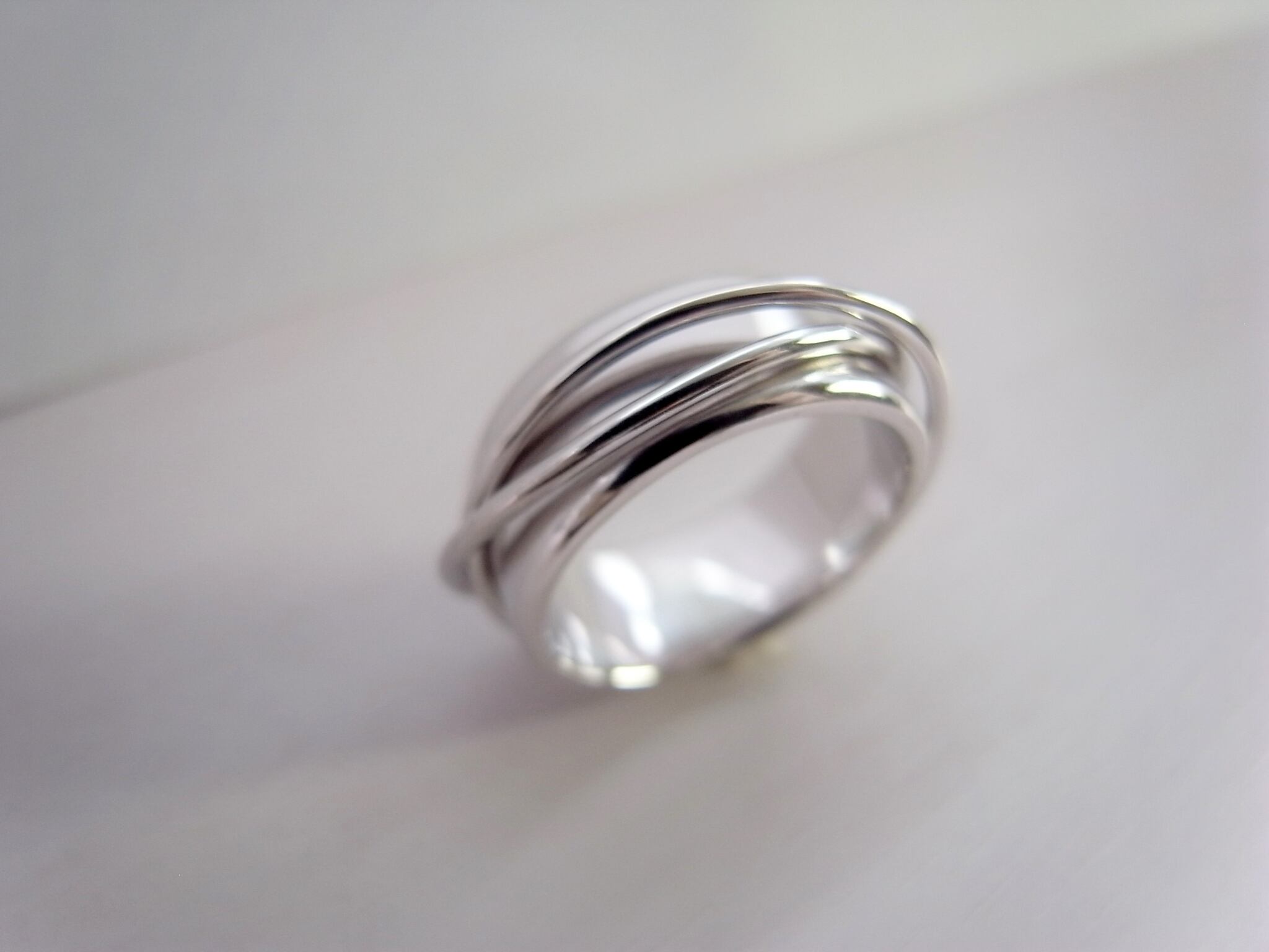 こちらの商品は太めのリングの上に2本の細いリングをクロスに這わせたデザインリングです