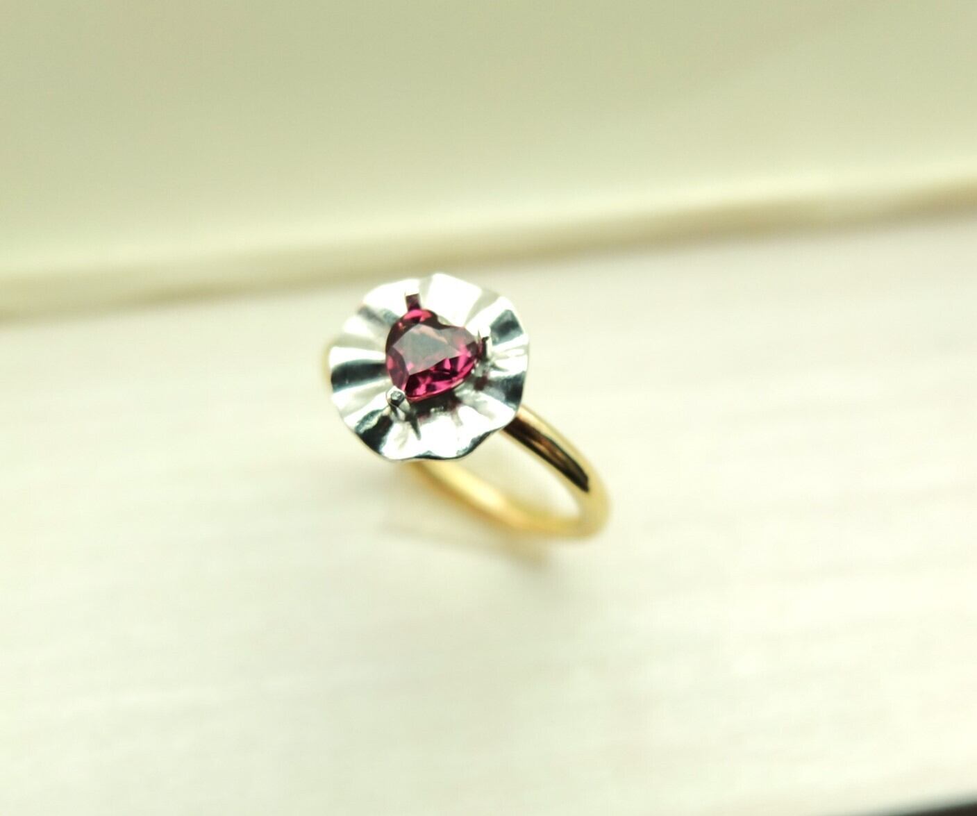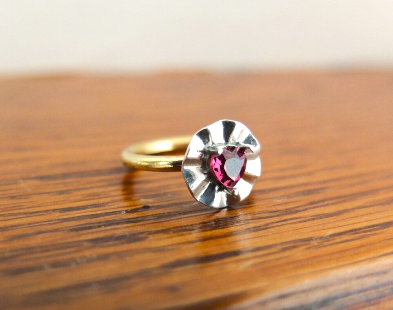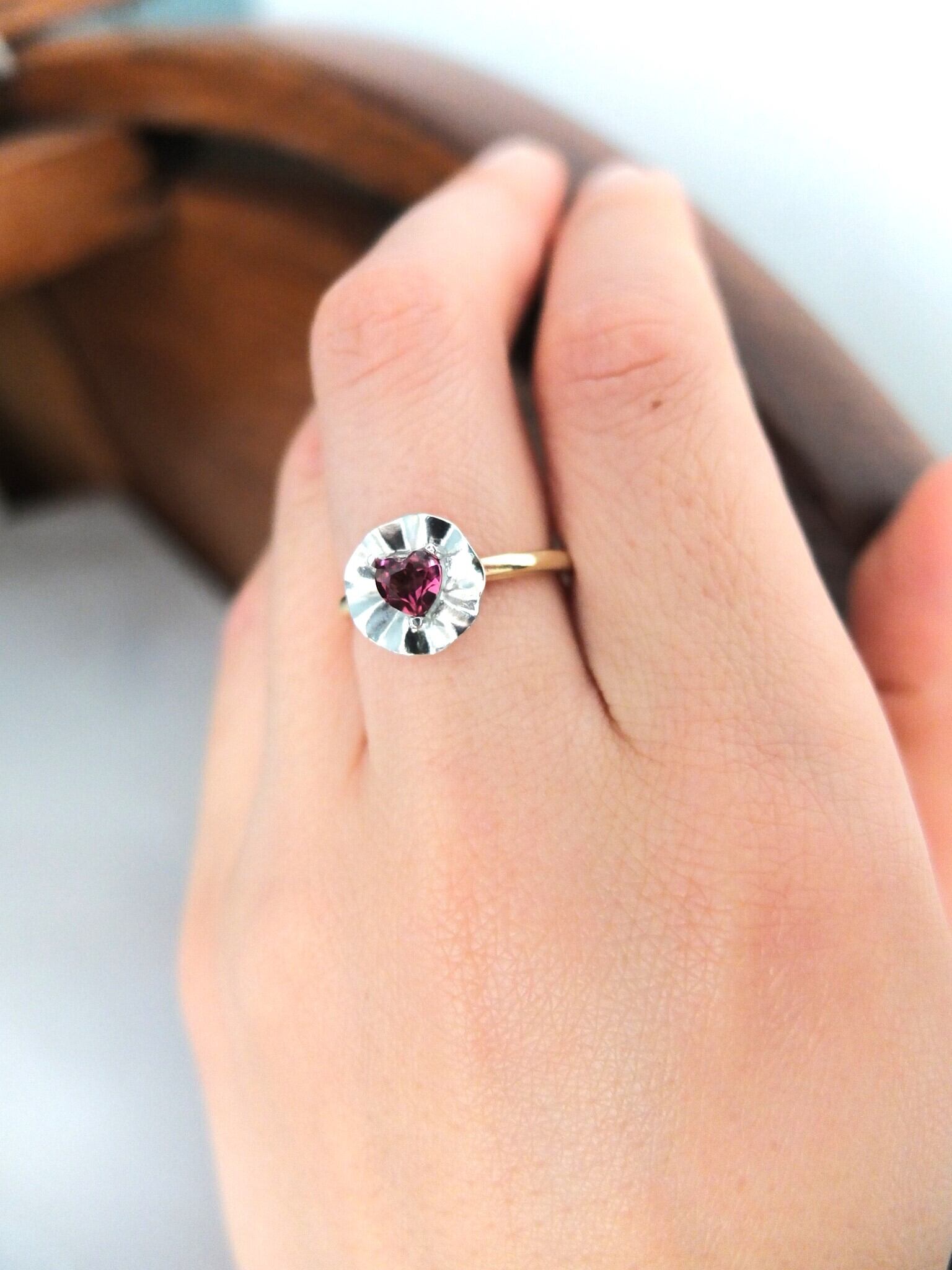 リボンをモチーフにした石枠にハートカットのロゼグレープガーネットを留めたリングです。