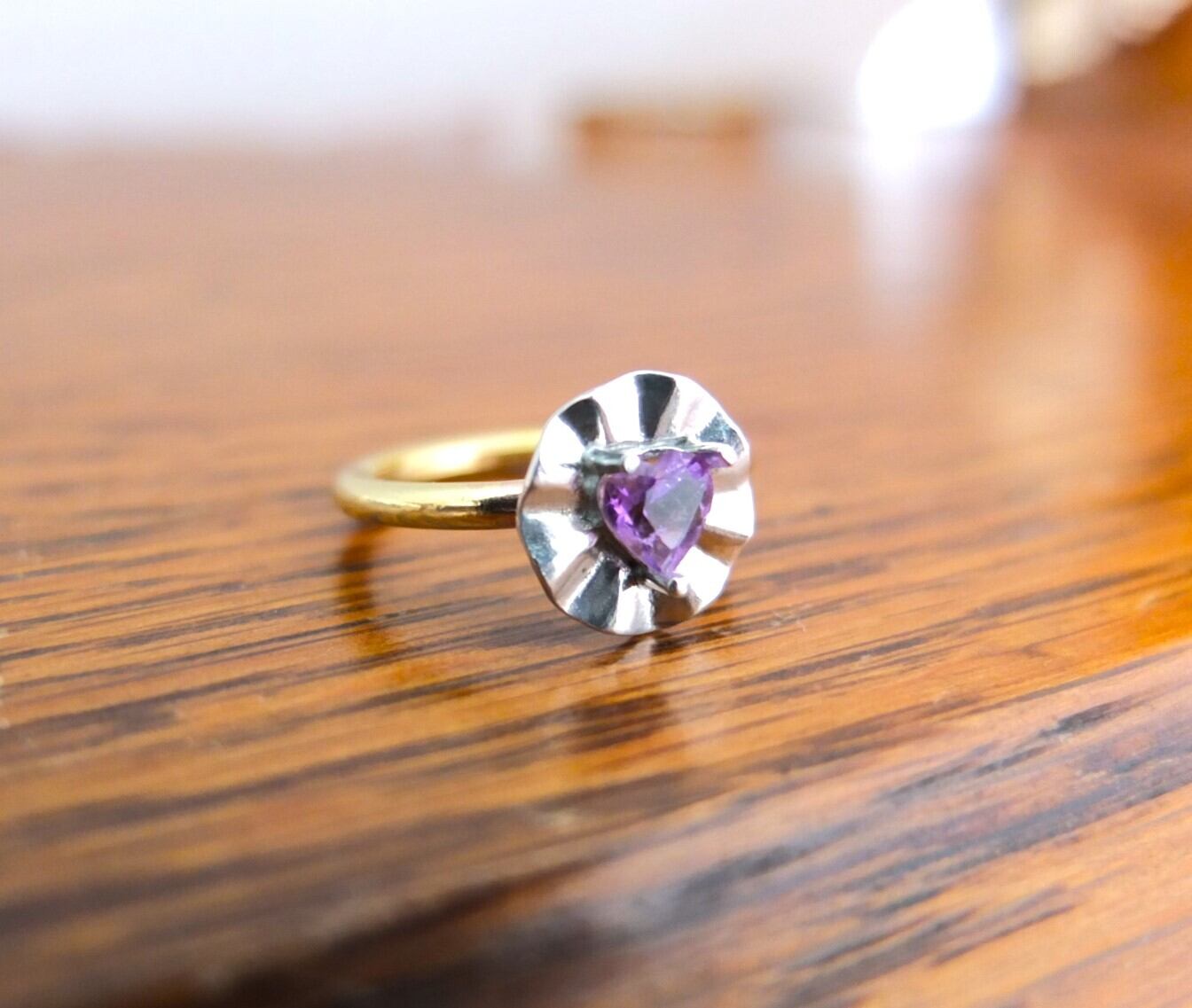 リボンをモチーフにした石枠にハートカットのアメジストを留めたリングです。